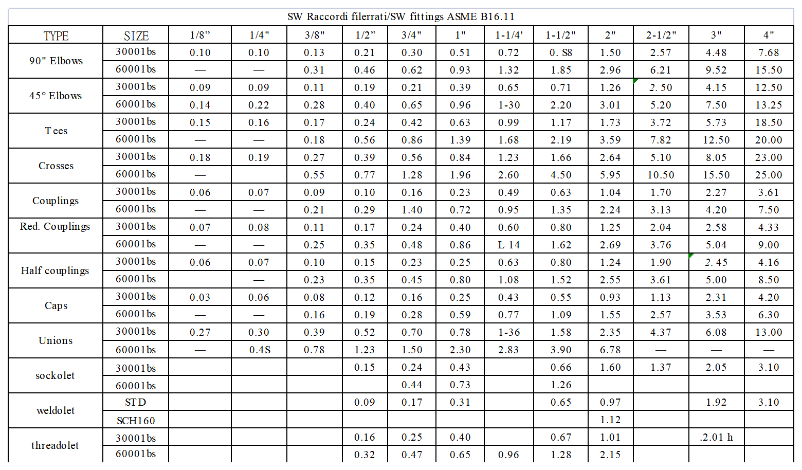 锻制承插管件重量 Forged_FITTING_weight_SW WEIGHT