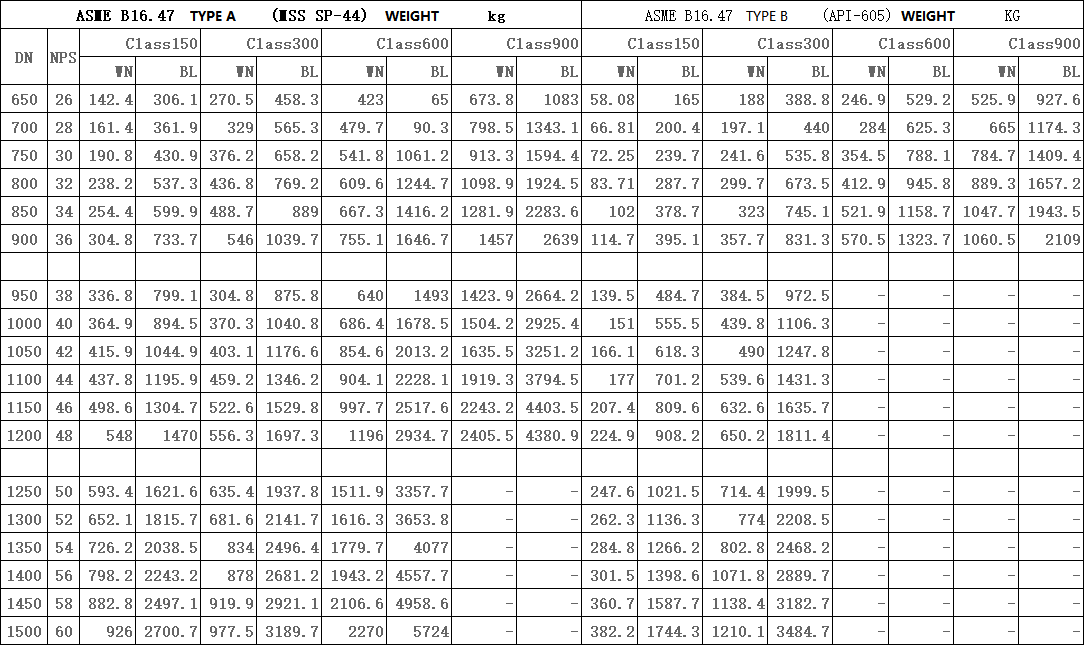 大口径法兰重量 FLANGE ANSI B16.47/MSS SP 44 WEIGHT