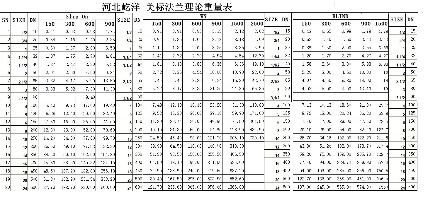 美标法兰重量 FLANGE ANSI B16.5 WEIGHT